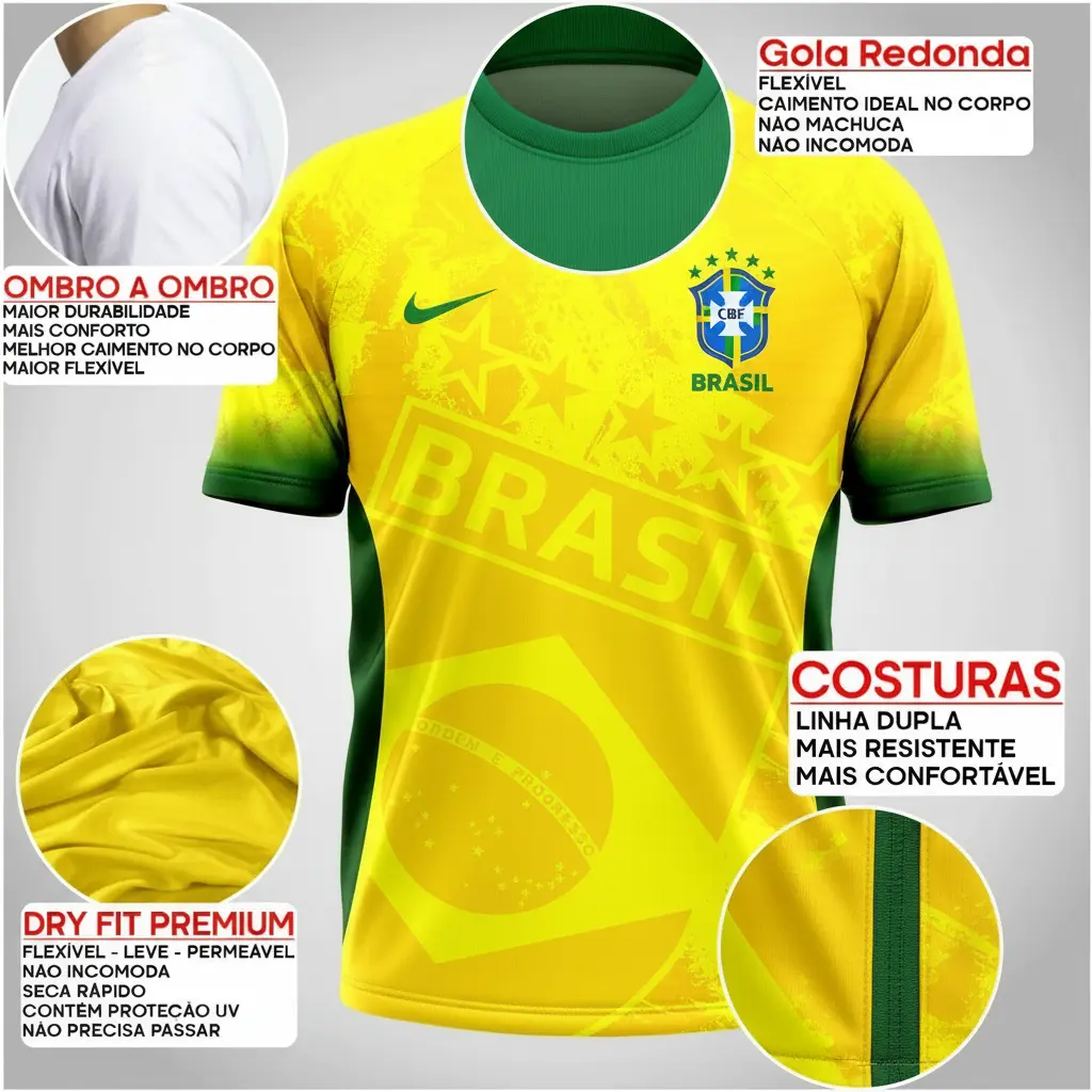 Com estampa 100% digital em alta definição, a camisa preserva cores vibrantes mesmo após várias lavagens, mantendo aquele visual impecável que todo torcedor busca. É a escolha certa para quem quer mostrar orgulho pelo Brasil com qualidade e estilo.